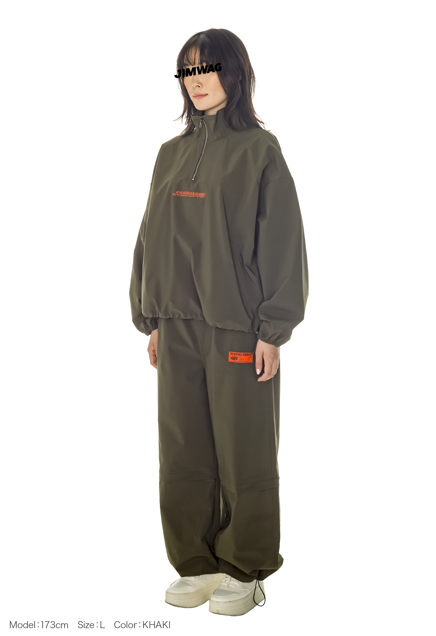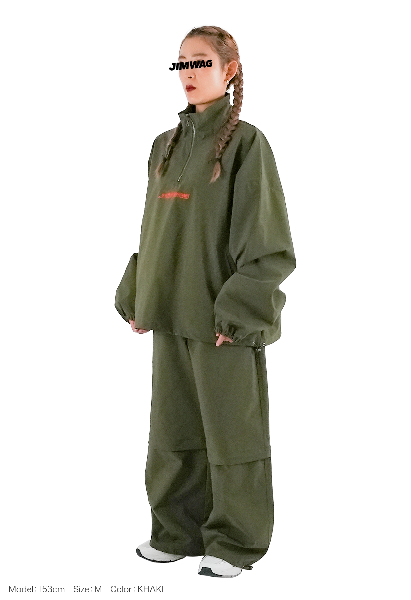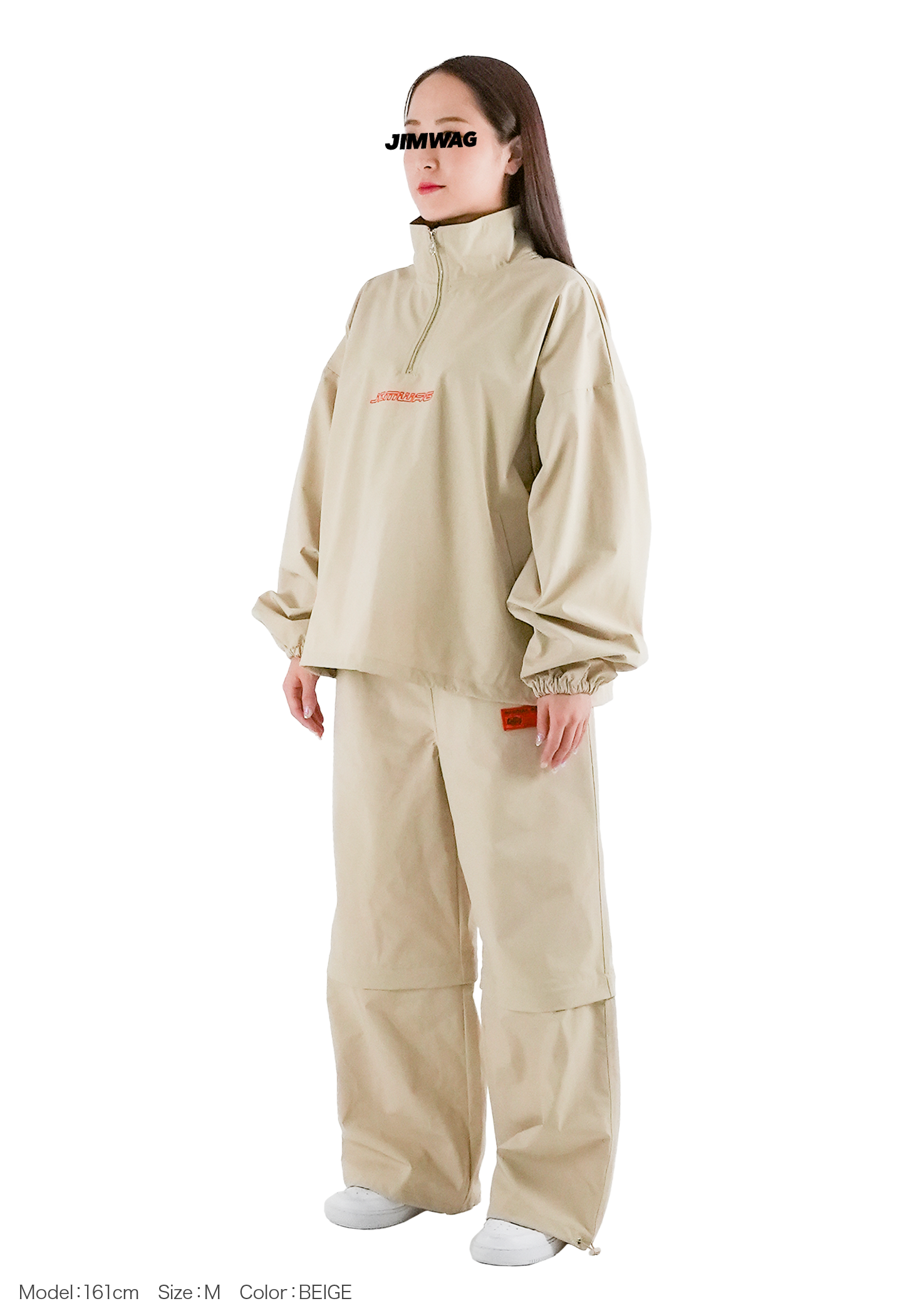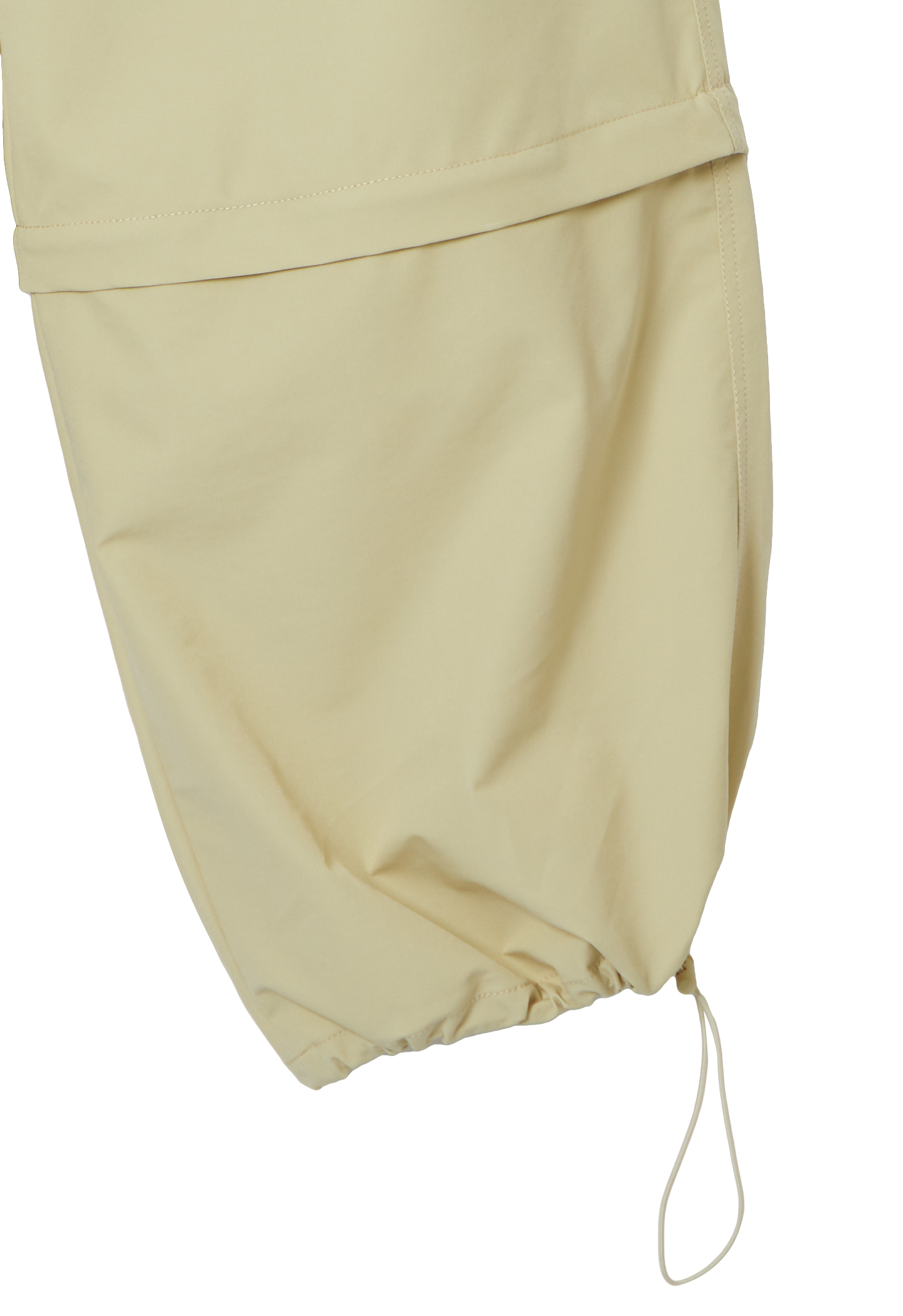 ファスナーで、フルレングスとハーフパンツにも使える2WAY仕様もポイント。シーズンレスで使えるアイテムです。裾にはドロストコードが付いているので、自分にあったシルエットで着用できます。メンズライクなオーバーサイズです。オリジナルのネームも入ったデザインです。